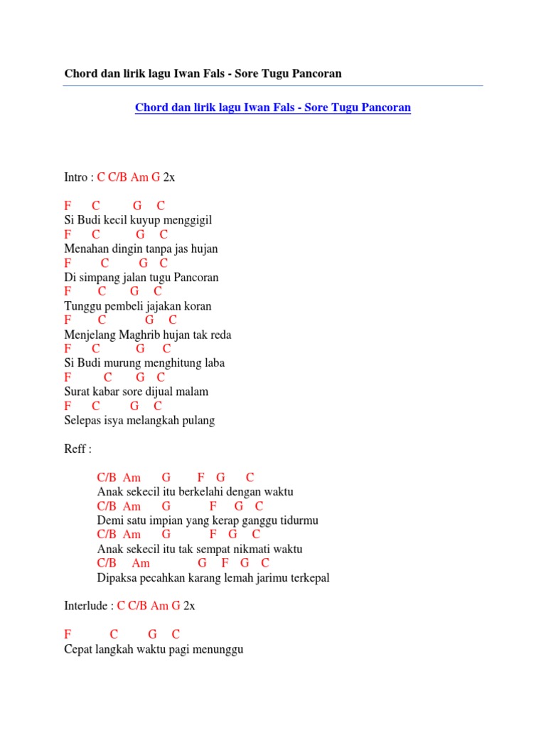 Chord Gitar Iwan Fals Sore Tugu Pancoran - Not Angka Lagu Iwan Fals Ujung Aspal Pondok Gede - Find the best version for your choice.. 'sore tugu pancoran' merupakan singel milik penyanyi iwan fals yang dirilis pada 1985 dalam album bertajuk sama. Hingga sekarang kantor cabang oi dapat ditemui di setiap chord gitar iwan fals — sore tugu pancoran. Hujan tak reda f c g c si budi murung…. Videos matching si budi kecil sore tugu pancoran revolvy. F c g c si budi kecil kuyup menggigil f c g c menahan dingin tanpa jas hujan f c g c di simpang jalan tugu pancoran f c g c tunggu pembeli jajakan koran.
